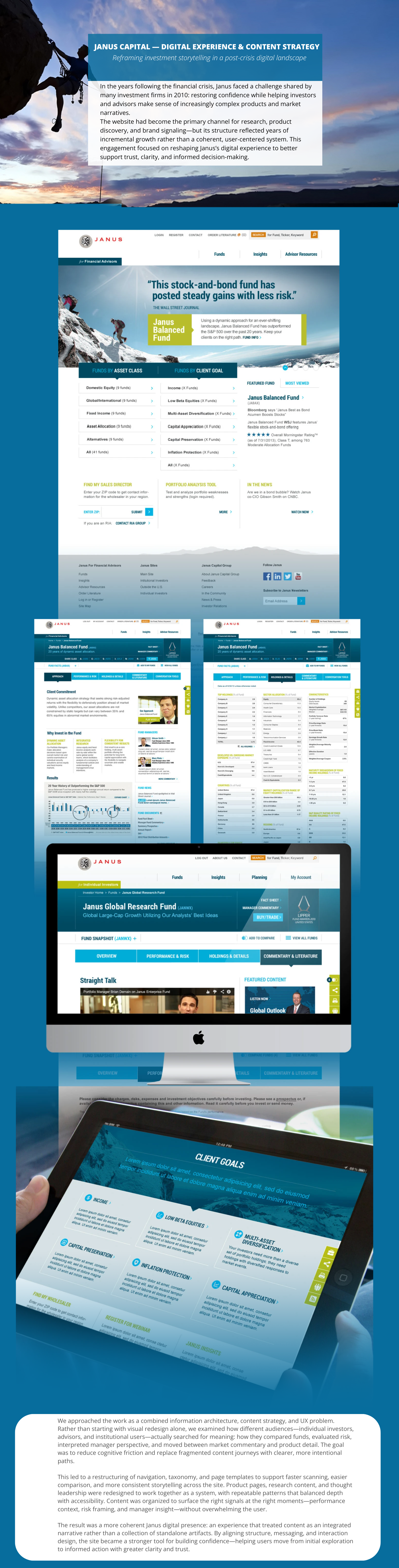 A post-crisis digital engagement focused on clarifying investment narratives through information architecture, content systems, and user-centered experience design—helping Janus present products, research, and perspective with greater coherence, credibility, and trust.