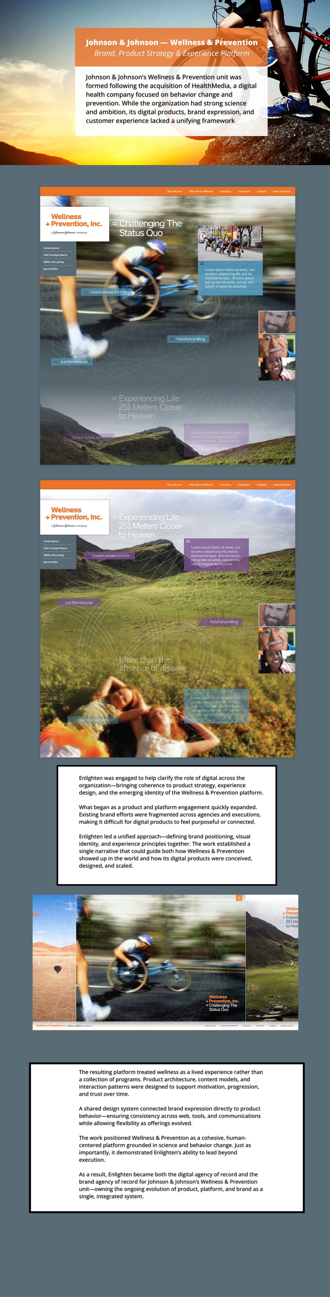 Brand, product, and experience leadership for Johnson & Johnson’s Wellness & Prevention unit—unifying digital platforms, behavior-change science, and brand expression into a single, scalable system.